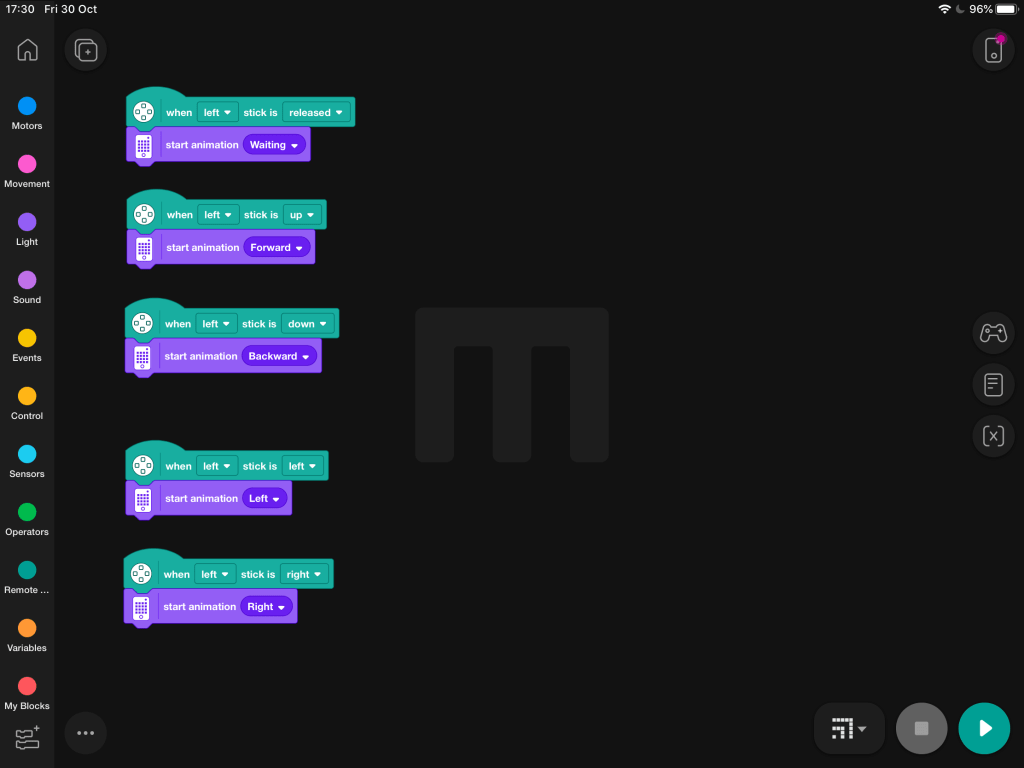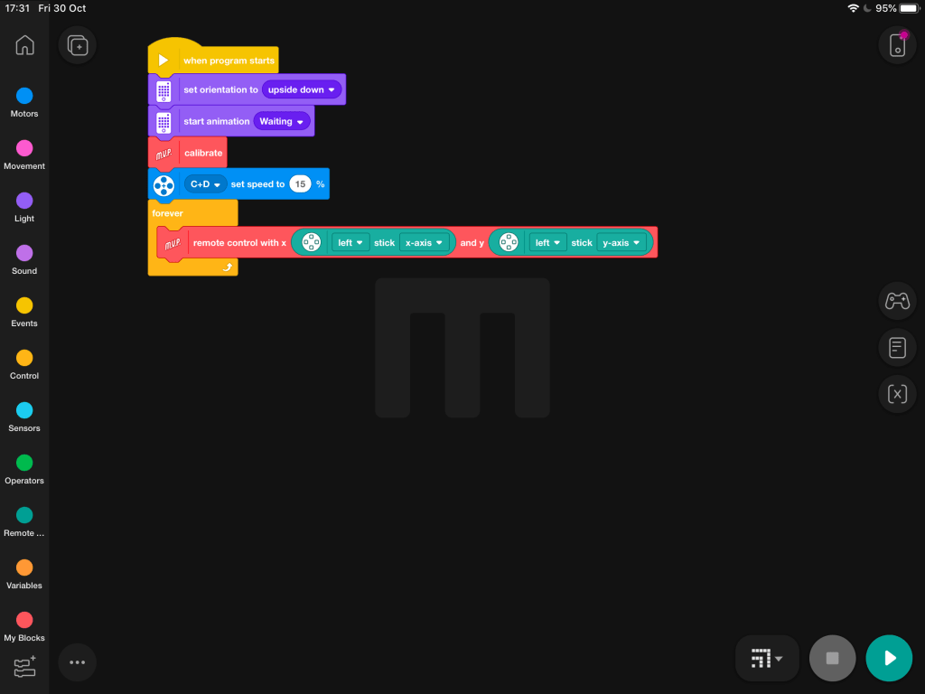 Before we move on, use a red MVP remote control brick to state how you want to move your robot. We are using a PlayStation 4 controller in this example. Lego Mindstorms Robot Inventor Kit supports Playstation & Xbox controllers out of the box. To use this feature, simply tick the option/s from the extensions area in the bottom left corner of the coding space. Add your green control bricks to the code to state which analogue stick you wish to use to drive your robot.