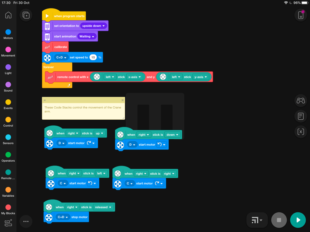 You have now completed all the steps necessary to code the MVP crane arm. Connect your controller and hit that play button to test out your work.