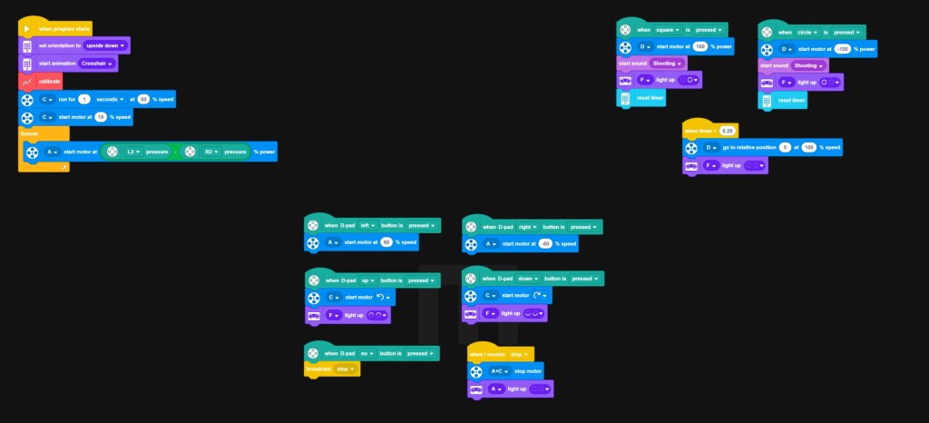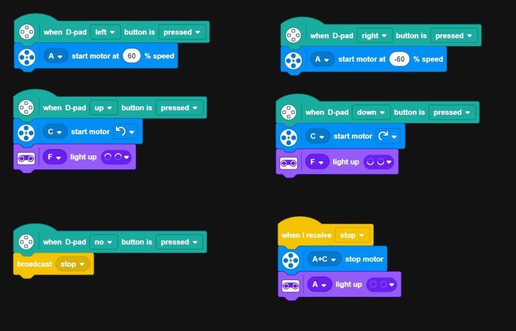 Before moving on, it is important to add a 5th block of code to tell the robot what to do when no input is being provided. In the example, I have used the ‘broadcast’ button with the word ‘stop’. The ‘stop’ instruction has been defined to tell both Motor A & motor C to stop moving. Remember, if you don’t include this part in your code, the turret and steering will continue to perform the last action you gave them, until either a new instruction is given or the motor can no longer move in that direction. This makes the robot very difficult to control.