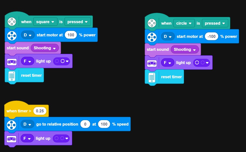 Now you can add some sound and light effects to go alongside the actions. Before finishing, add one final block of code to reset the position of motor D. This will place the motor back into its starting position after each shot is fired, meaning that you don’t need to do this manually.