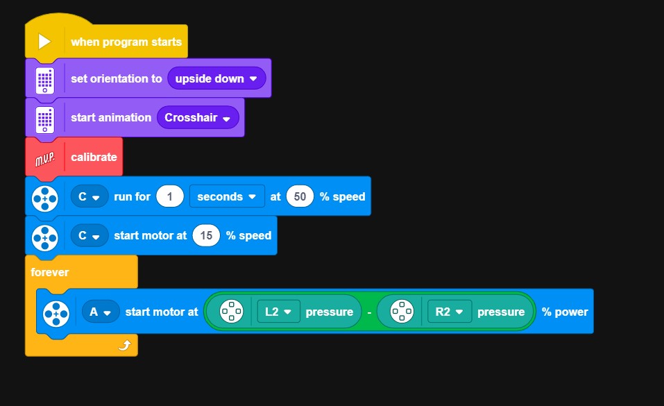 Motor C will be used to raise and lower the turret for aiming. Add motor speed blocks to control the speed the motor moves at later on. Like with the crane build, the motor speed doesn’t need to be very fast. A slower speed will result in a more controllable robot.